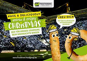 Rietberg, 03. Dezember 2024. Alle Jahre wieder lädt der BVB zum weltweit größten Weihnachtslieder-Singen nach Dortmund ein. Am 08. Dezember 2024 wird der SIGNAL IDUNA PARK erneut zur Bühne des festlichen Chorerlebnisses, wenn rund 70.000 Menschen im ausverkauften Stadion zusammenkommen, um sich gemeinsam auf die Weihnachtszeit einzustimmen. Unterstützt werden sie dabei von bekannten Musiker:innen wie Stefanie Heinzmann, Jo Marie Dominiak, Dieter Falk und Alexander Klaws, die mit ihren beeindruckenden Stimmen und mitreißenden Performances für ein unvergessliches vorweihnachtliches Erlebnis sorgen werden. Die Frostkrone Food Group engagiert sich bereits seit mehreren Jahren als Partner dieser besonderen, karitativen Veranstaltung.